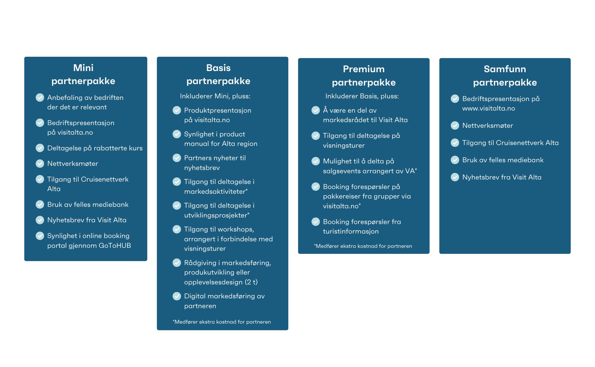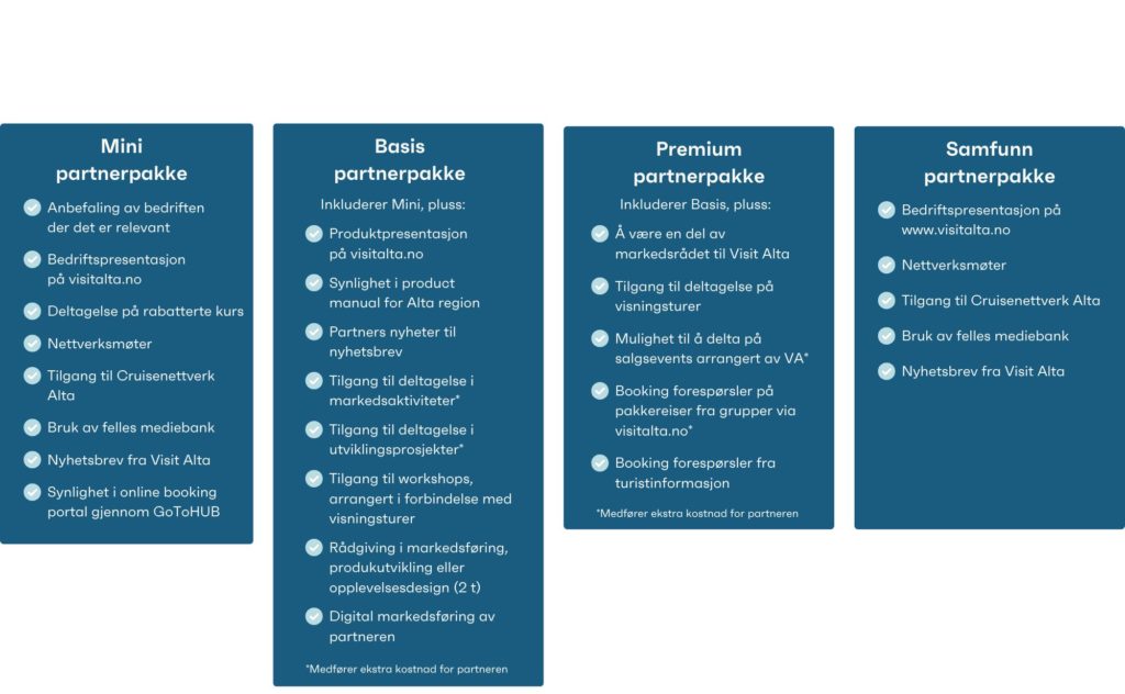 Avtalen skal reflektere det samarbeidsnivået bedriften ønsker seg, gjennom en differensieringsmodell med fire alternative partnerpakker.Alle partnere i Visit Alta, uavhengig av pakken man velger, er med i et felleskap og bidrar til å bygge Alta som verdens beste arktiske reisemål og Norges beste sted å bo.