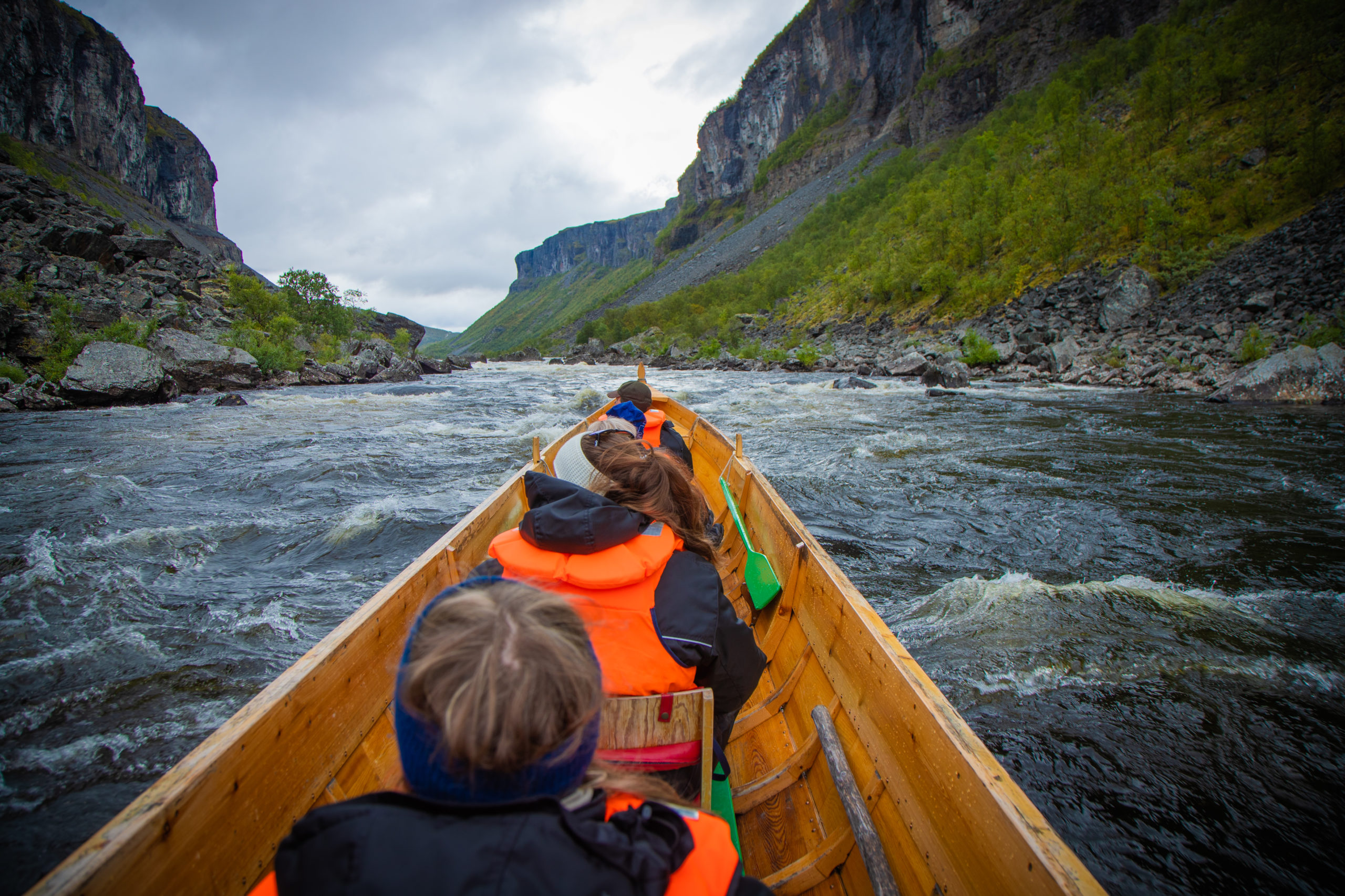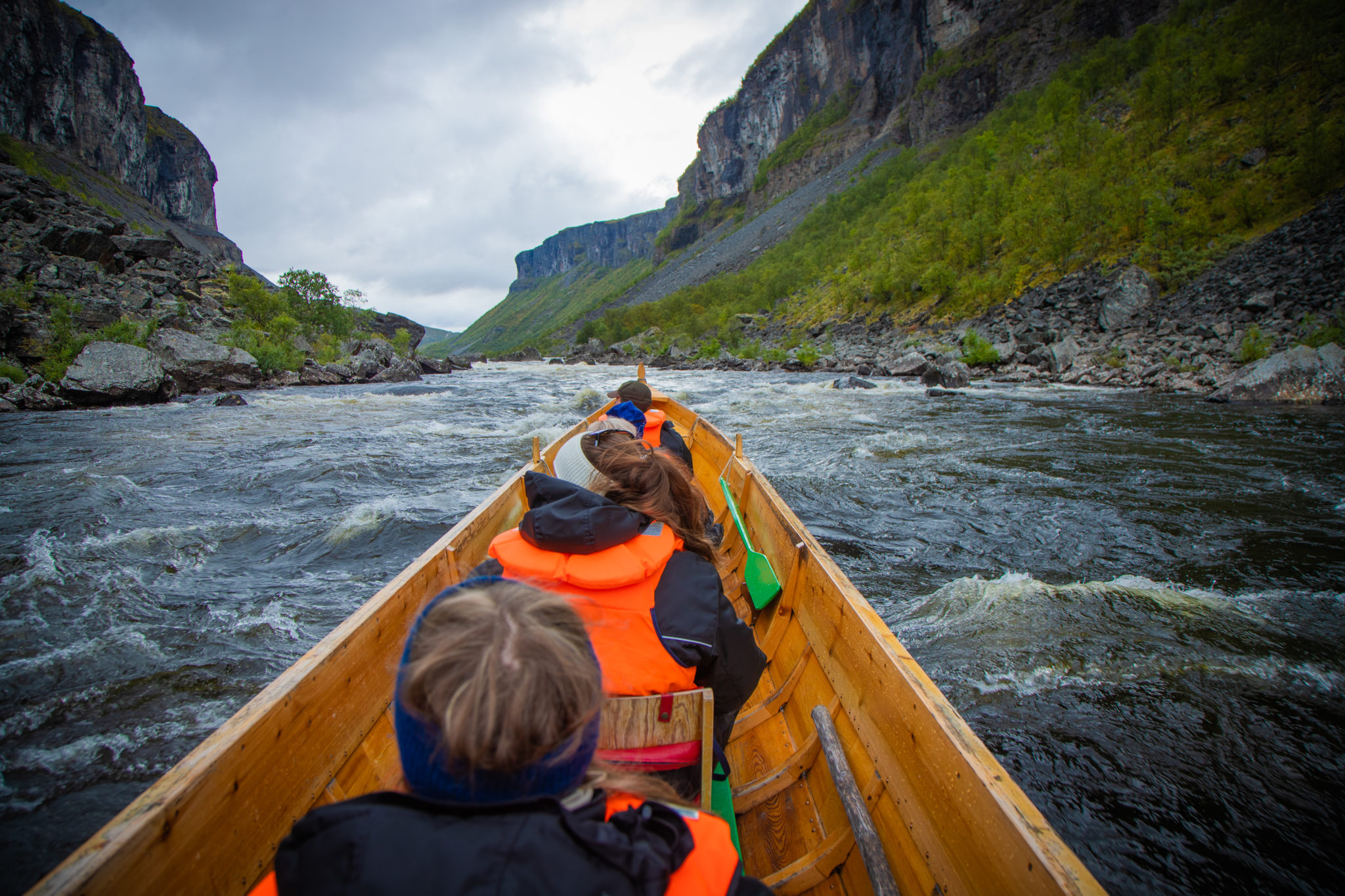 Soon the landscape changes character, and the mountains and cliffs creep closer to the river. Eventually, the landscape appears dark and intense as we drive through several rapids. Finally, we reach Gabonakken, also known as Gabo, where the unique and breathtaking form of the Alta Canyon dominates the landscape.