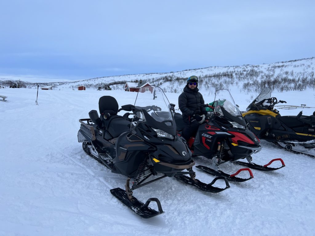 Ride across snow-covered landscapes on a guided snowmobile tour and take in the beauty of the Arctic light.