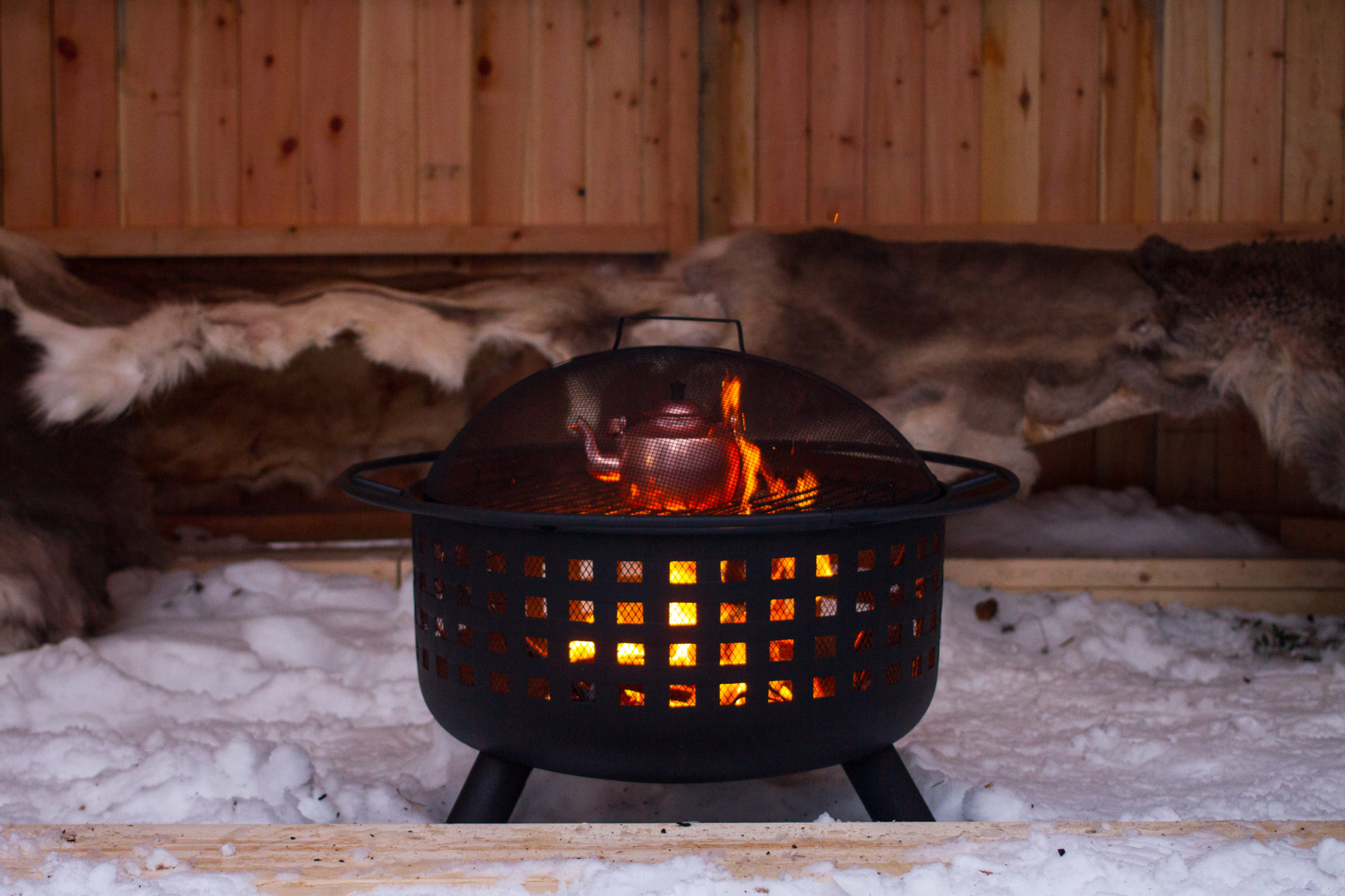 Turen tar deg gjennom skogen og langs Alta elven, og flyter på lyden av de muntre bjellene gjennom spektakulær natur. Nær slutten av turen kommer du til en gapahuk og tar deg en pause. En forrett, middag og dessert serveres rundt bålet for et fantastisk 3-retters måltid, beskyttet mot været av gapahukens halvegg. Sammen med samtale og lokale historier! Så er det tilbake til gården for hjemturen til Alta.