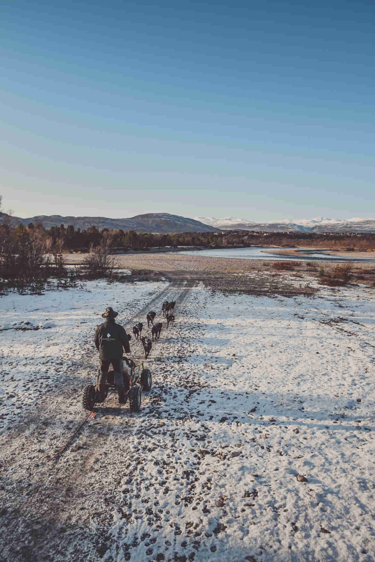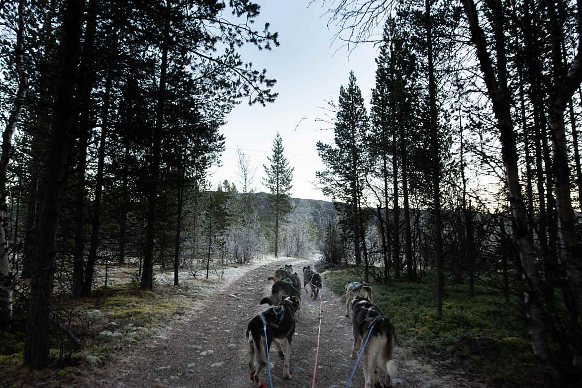 Når temperaturen faller, før snøen gjør det, tar vi gjestene våre ut på hundevogn istedenfor hundeslede. Tross alt trenes hundene på flere måter enn med sleden. Vognene er som hundesleder med hjul og sykkelstyre. De tilbyr like mye moro og kan til og med være lettere å kjøre. Turen tar deg gjennom det arktiske landskapet når høsten blir til vinter, i en fantastisk fargeskjerm over det varierte landskapet. Gjennom furuskog og langs vakre Altaelva går turen.
