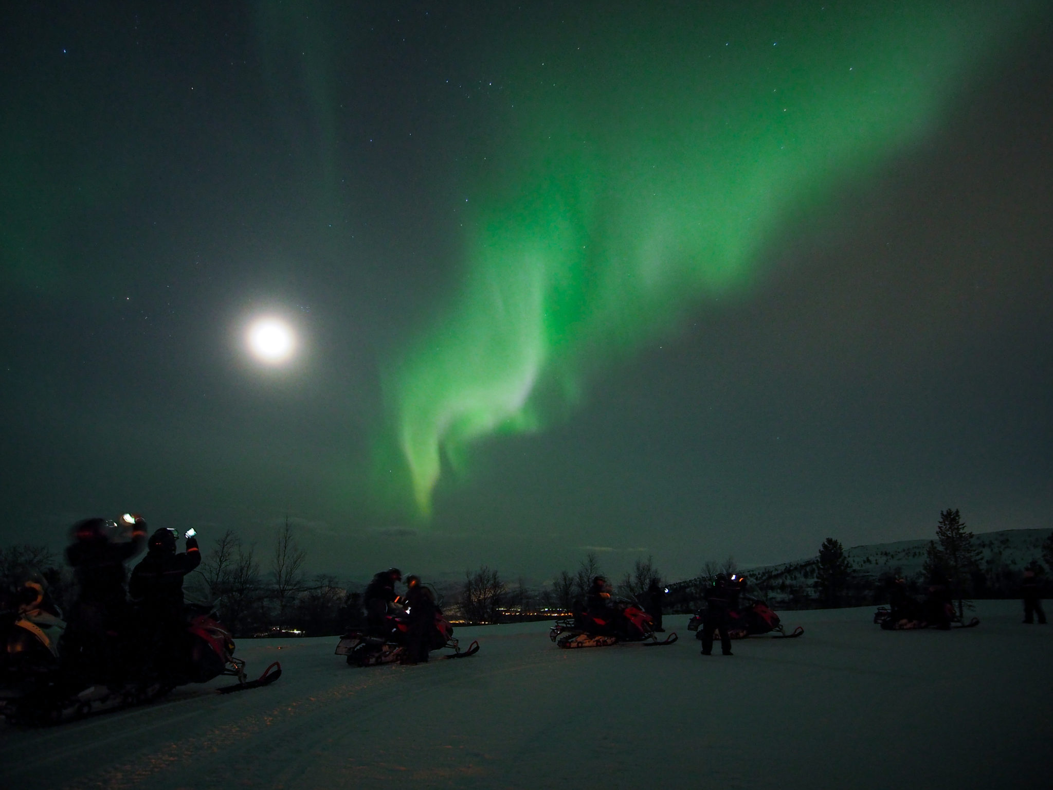 Kombiner spenningen med å kjøre snøscooter gjennom den arktiske kvelden mens du leter etter det spektakulære nordlyset. Nordlys guiden leder deg gjennom villmarken, gjennom dalen der Altaelva renner og videre opp på Finnmarksvidda, hvor fraværet av bakgrunnslys maksimerer sjansen din for å se Aurora Borealis. Før turen starter vil guiden gi deg varm kjeledress, vintersko, hansker og hjelm, samt instruere deg i sikker bruk av snøscooteren. Guiden vil også kunne hjelpe deg med å oppnå de beste bildene av nordlyset.
